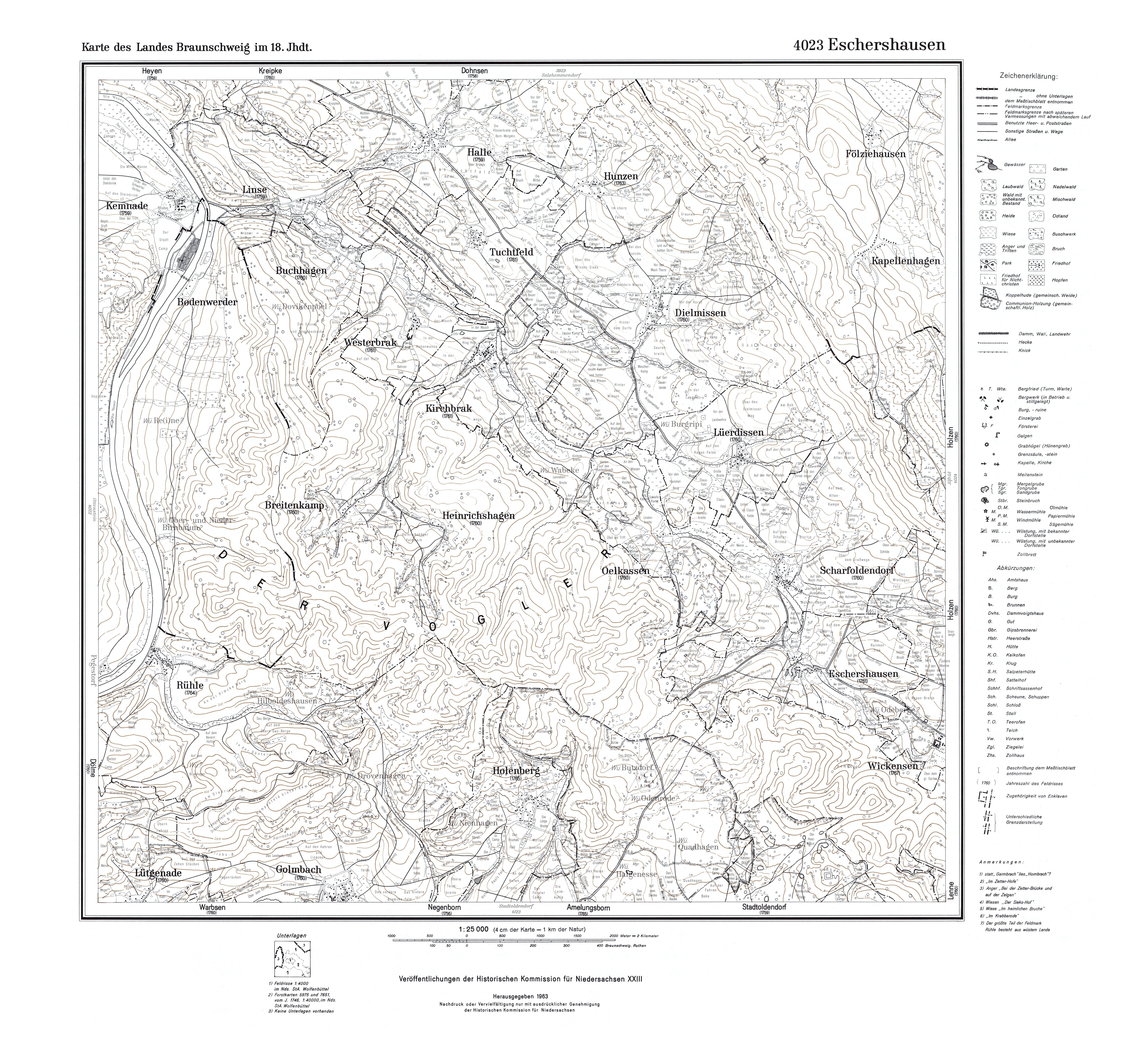 In den Jahren 1746 bis 1784 wurde die Braunschweigische General-Landes-Vermessung im Maßstab 1:4 000 aufgenommen. Hier abgebildet ist eine 1963 neu gezeichnete Arbeitskarte im Messtischblatt-Massstab von 1:25 000, die nicht die Details des Originals zeigen kann. Zur Entstehung einige Zitate von den Internetseiten des Landesamtes für Geoinformation und Landesvermessung Niedersachsen (LGLN):